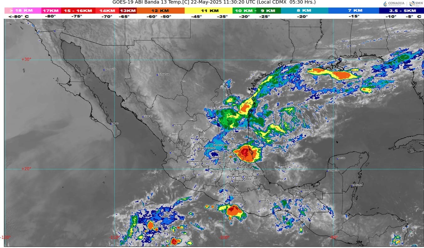 Por otro lado, una circulación anticiclónica en niveles medios de la atmósfera, mantendrá el ambiente caluroso a muy caluroso sobre la República Mexicana, prevaleciendo la onda de calor en Sinaloa, Nayarit, Jalisco, Colima, Michoacán, Guerrero, Oaxaca, Chiapas (centro y oeste), Durango (oeste y sur), Zacatecas (sur y suroeste), Morelos, Puebla (suroeste), Campeche y Yucatán (suroeste).