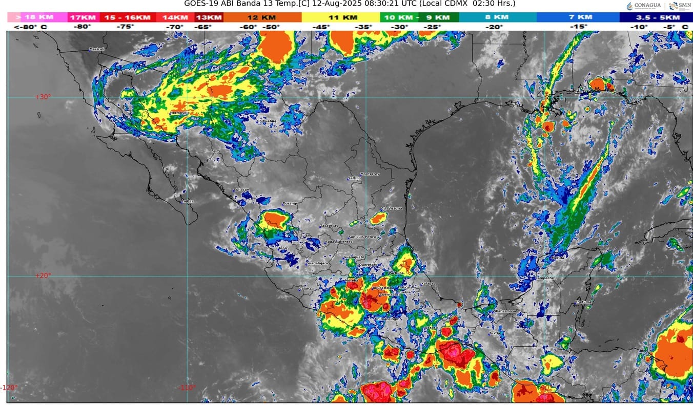 Por otra parte, un canal de baja presión sobre la Mesa del Norte y la Mesa Central, en interacción con una vaguada en altura extendida desde el noreste hasta el occidente del país, con inestabilidad atmosférica y con el ingreso de humedad del océano Pacífico y golfo de México, ocasionarán lluvias puntuales intensas en Jalisco y Colima; lluvias fuertes a muy fuertes en las regiones antes mencionadas, además del oriente y sur de la República Mexicana, con descargas eléctricas, y posible caída de granizo en el occidente y centro de México.