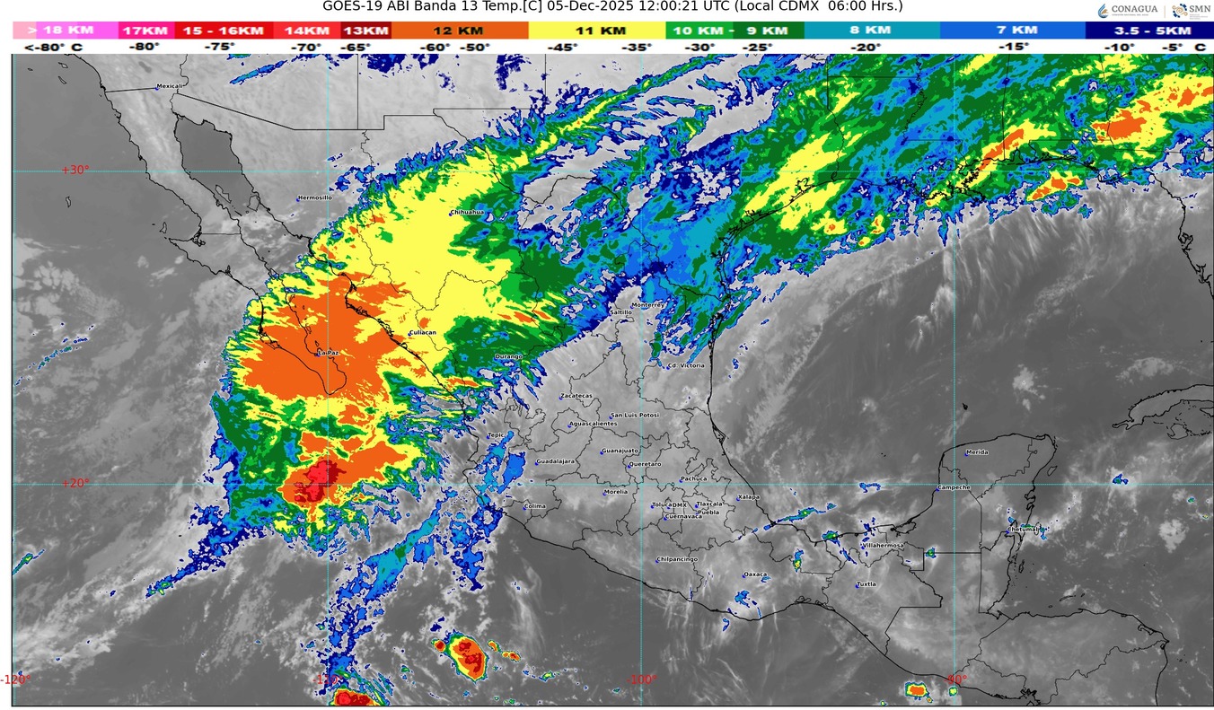 El abundante ingreso de humedad proveniente del océano Pacífico asociado con un río atmosférico y una vaguada en niveles medios y altos de la atmósfera sobre el noroeste de México, ocasionarán lluvias y chubascos en las regiones mencionadas, con lluvias puntuales fuertes en Baja California Sur, Sinaloa, Durango, Zacatecas, Nayarit y Jalisco; además de probable caída de nieve o aguanieve en sierras de Sonora, Sinaloa, Durango y Chihuahua.